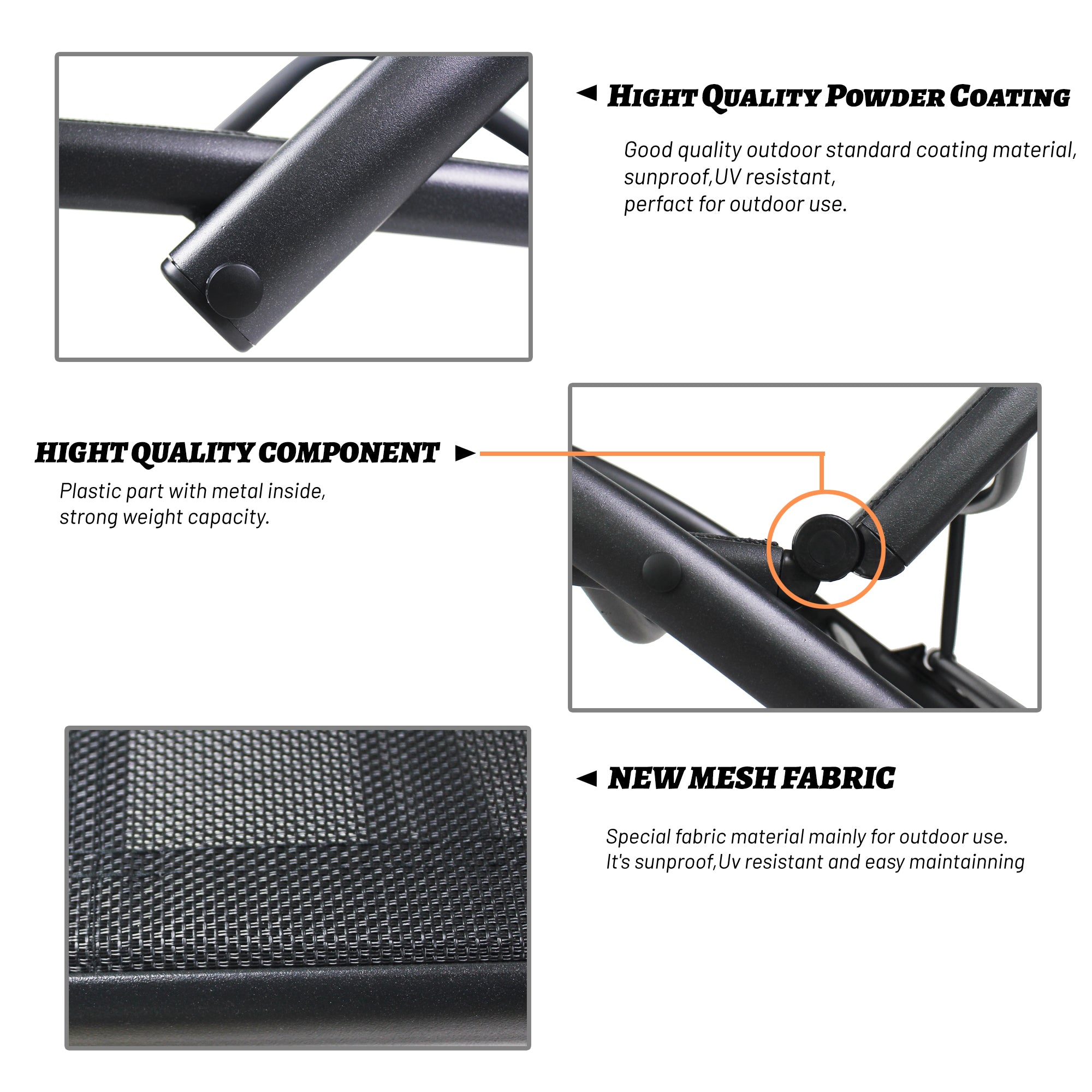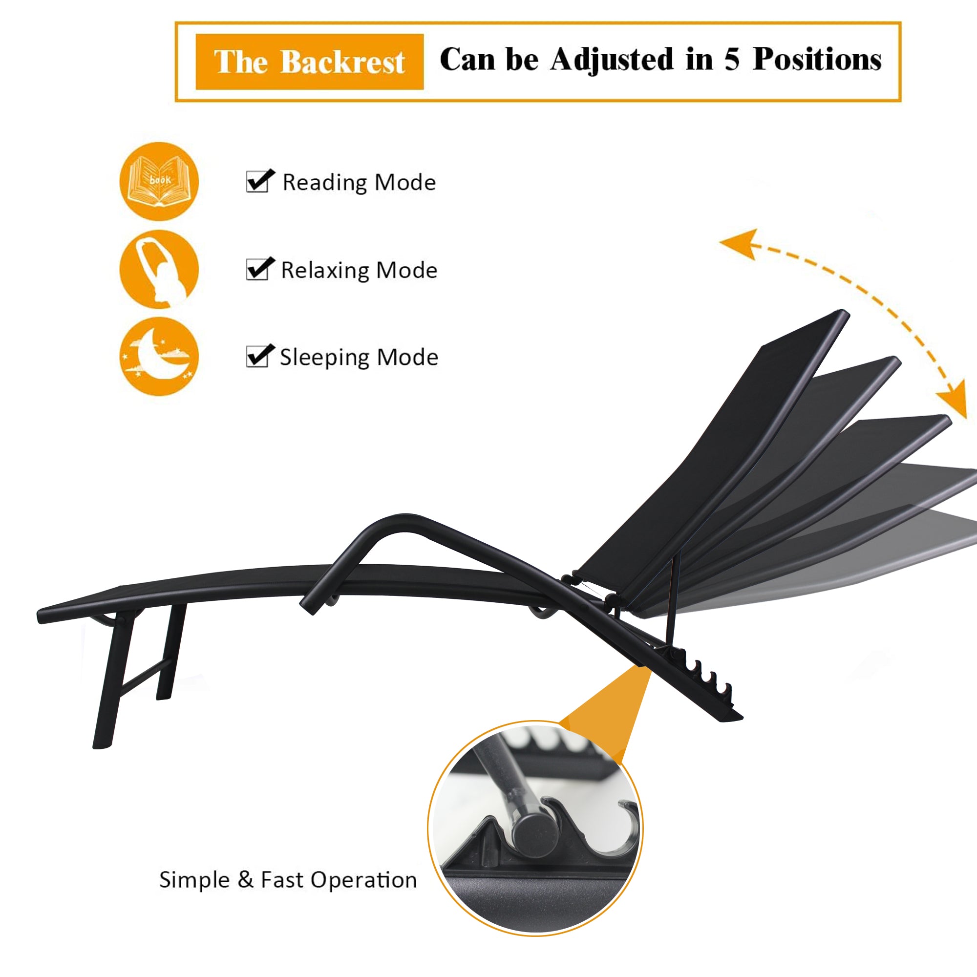 - [Durable Material]--The back and seat fabric are made of UV-resistant breathable Textilene fabric and powder coated Aluminum frame for long lasting use, water and oil proof, quick dry and easy maintenance.This lounge chair ensures its durability and rust proof. Strong steel frame supports chairs stability and balance. It provides sturdy support with max weight capacity of 270 lbs.This outdoor chaise lounge can be used for a long time.